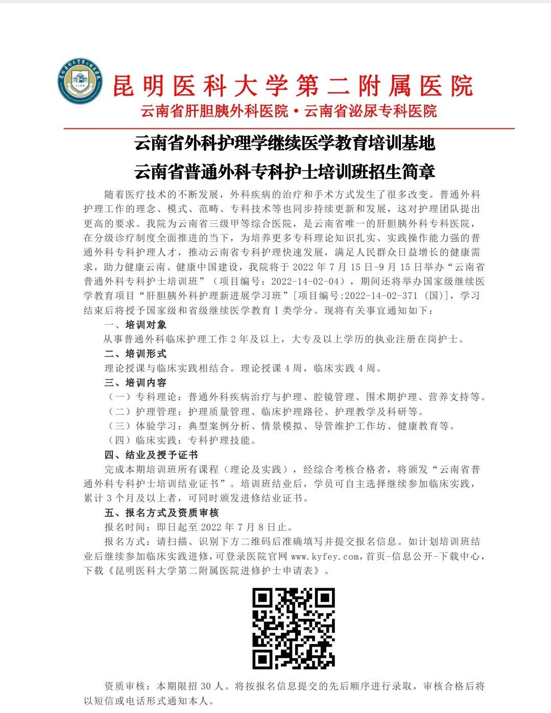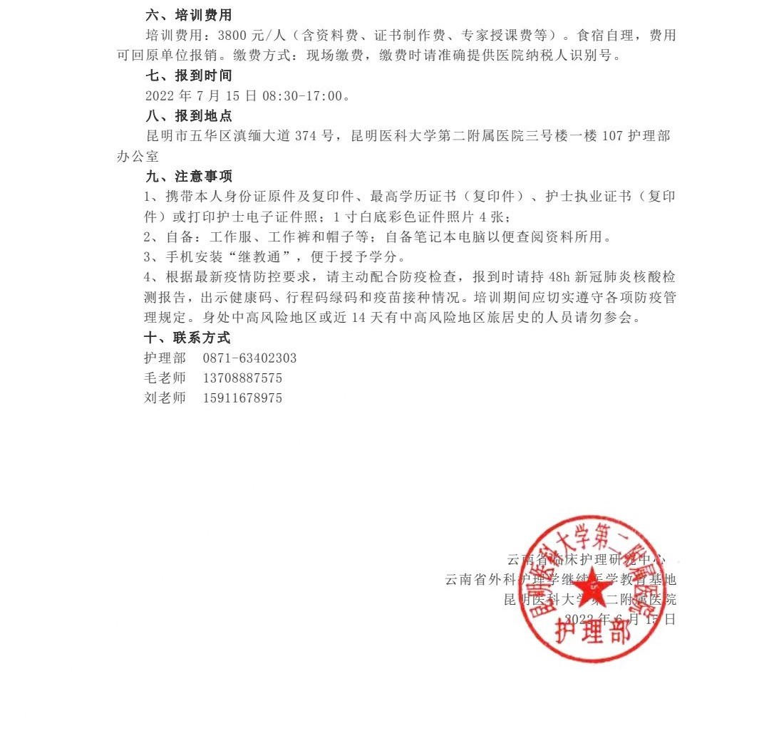 云南省外科护理学继续医学教育培训基地云南省普通外科专科护士培训班招生简章
